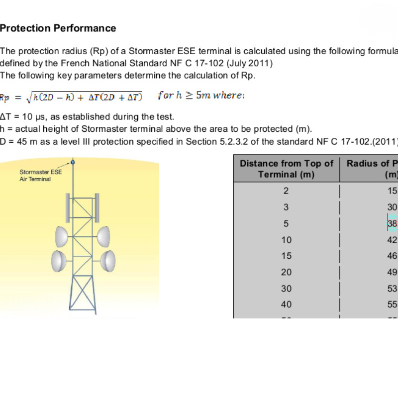 Stormaster ESE Telco có bán kính bảo vệ tiêu chuẩn 38m ở cấp IV theo nội dung file, và trong một số điều kiện độ cao lắp đặt phù hợp, phạm vi bảo vệ có thể mở rộng hơn.